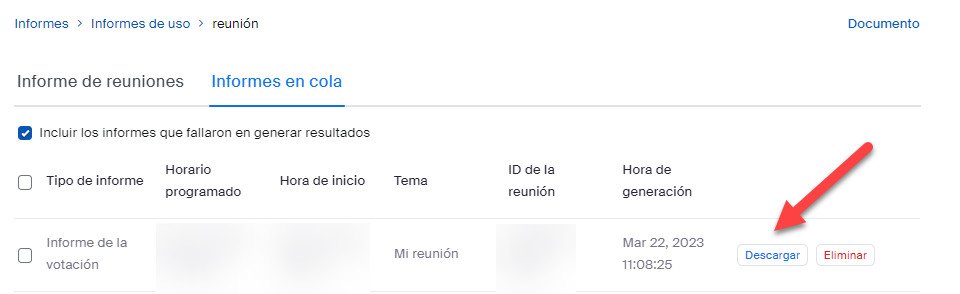 Zoom ens redirigirà a la pestanya Informes en cola on podeu descarregar l'informe com arxiu CSV.