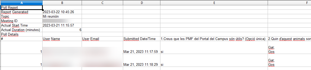 On veurem les dades mencionades abans com són Nom d'usuari i adreça de correu electrònic, Data i hora de presentació de la seva resposta, la pregunta/es de votació/qüestionari i la resposta/es del participant.