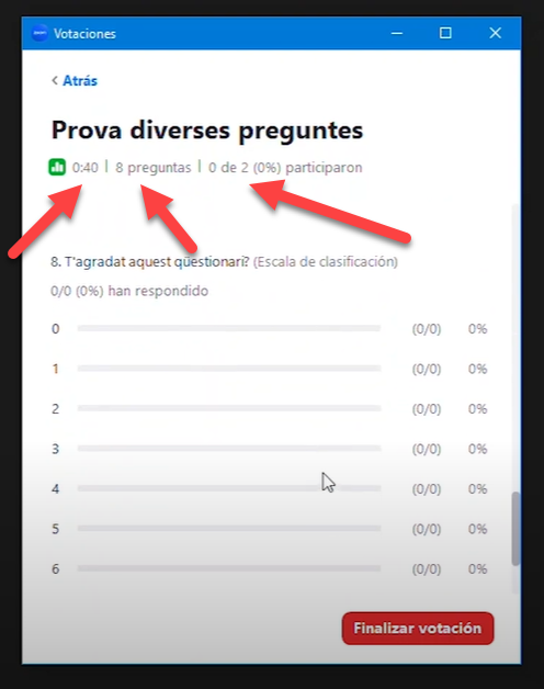 A sota del títol, trobareu el comptador de temps, el nombre de preguntes i el nombre de participants que estan responent l’enquesta.