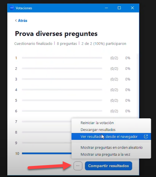 Si feu clic als tres puntets, apareixerà un menú desplegable que permetrà reiniciar la votació, descarregar els resultats, veure’ls a través del navegador o escollir la manera en la qual es mostren les preguntes: en ordre aleatori o mostrar només una pregunta a la vegada.