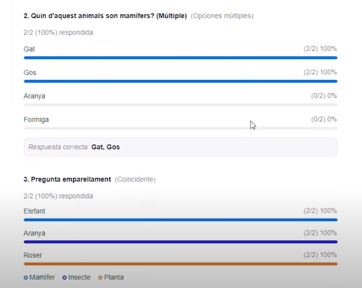 Podeu anar veient, en temps real, quines són les respostes que els alumnes donen. Les dades s’expressaran en nombres absoluts i en percentatge.