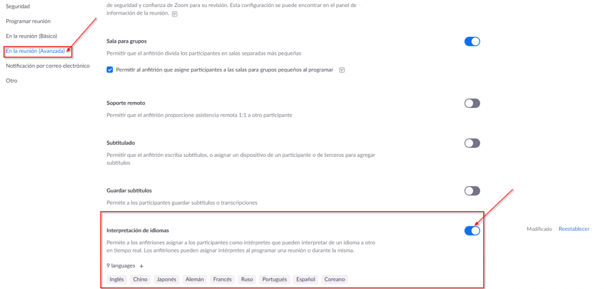2. Aneu a A la reunió (avançat), i activeu Interpretació d'idiomes: