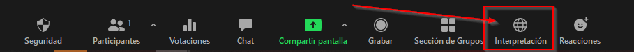 4. Els intèrprets i assistents podran fer clic a Interpretació a les opcions de la reunió i seleccionar un canal d'idioma: