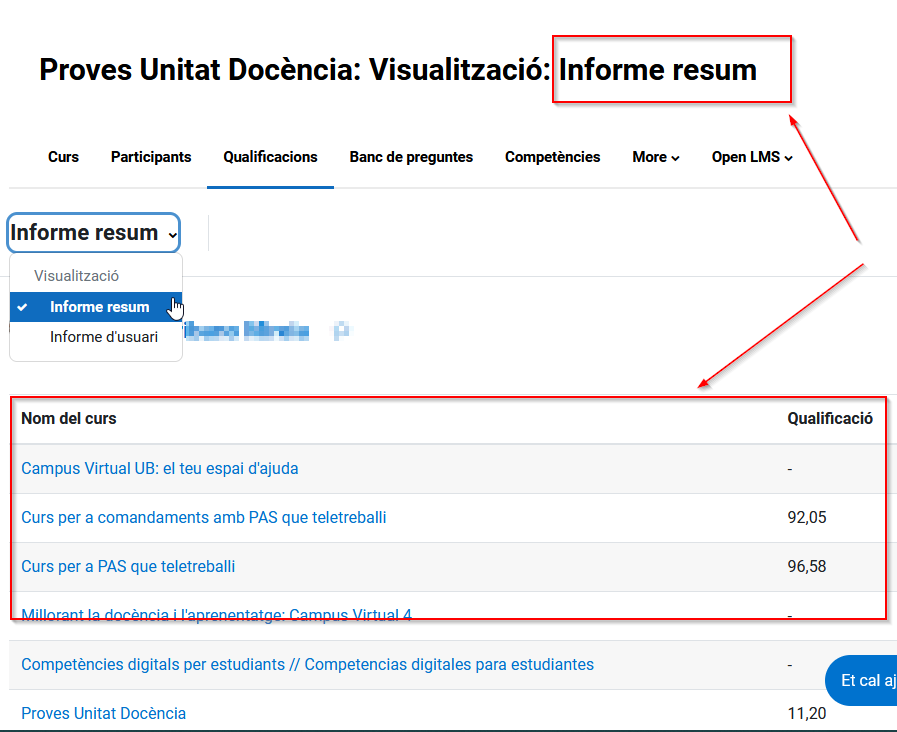 També des de qualsevol curs teniu l'opció de l'Informe resum, des d'on podreu veure un llistat amb tots els vostres cursos, la seva qualificació i fent clic al curs podreu anar a l'informe d'usuari concret d'aquell curs.