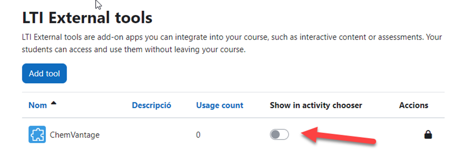 Amb el botó “Show in activity chooser” el professorat pot decidir si vol que una eina LTI determinada aparegui al selector d’activitat del seu curs: