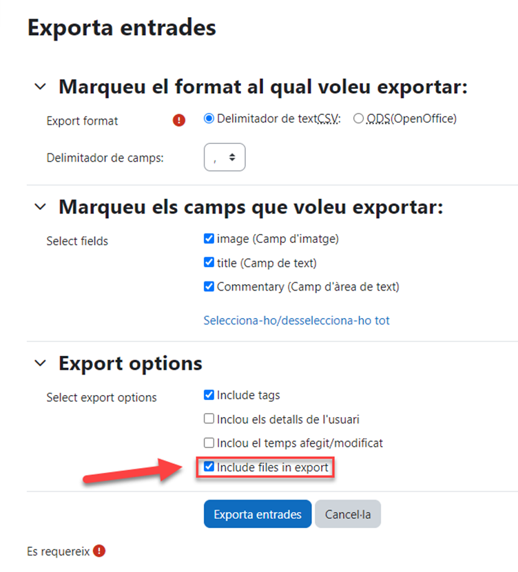 Ara es poden incloure arxius quan s’exporten les entrades de la base de dades.