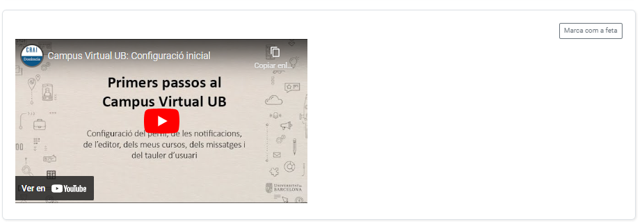 Vídeos: podreu trobar vídeos incrustat al curs. Podreu visualitzar-los de manera semblant a la de la imatge: