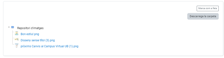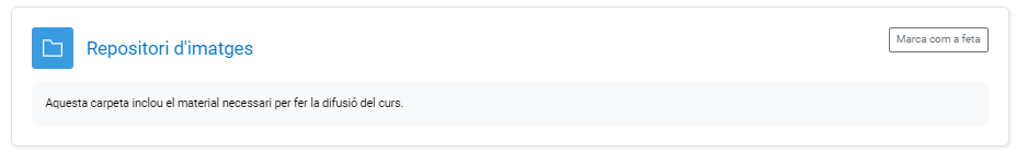 Carpetes: aquest recurs permeten al professorat agrupar i organitzar els fitxers que pengen en un curs. Podreu trobar-vos una carpeta de dues maneres: amb el contingut mostrat a la pàgina principal del curs: