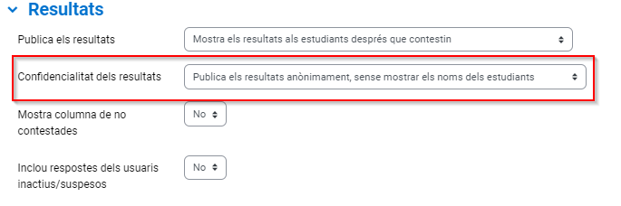Confidencialidad de los resultados permite elegir si los resultados de la consulta se ven de forma anónima o si se muestra la información de todos los alumnos y las respuestas escogidas.