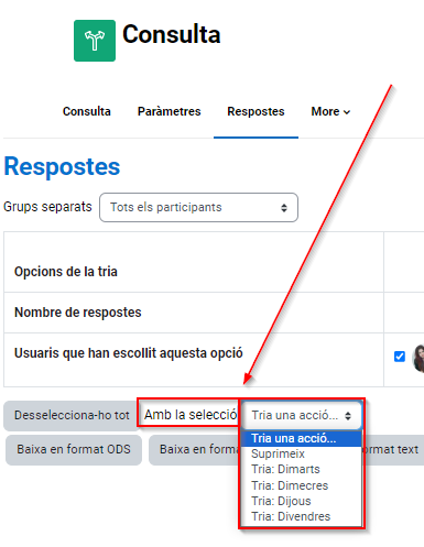 Para ver las elecciones del alumnado y el resultado de la consulta, es necesario acceder a la consulta. Una vez dentro, es necesario clicar en Respuestas. Desde esta misma página, mediante el menú desplegable Elija una acción… se pueden borrar las respuestas de alumnos concretos activando las respectivas casillas, en caso de que sea necesario.