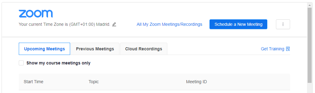 A continuación se abrirá la sala Zoom del curso. Para añadir una reunión, clicad en el botón "Schedule a New meeting":
