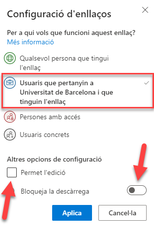 - Clicamos en "Usuarios que pertenezcan a Universidad de Barcelona y que tengan el enlace" y decidimos si permitimos la edición y/o la descarga.