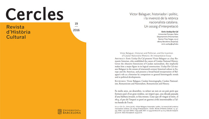 Enric Ucelay-Da Cal presents Vìctor Balaguer as a key Romantic historian, who established the canon of Catalan National History.Given the obsessive historicism of Catalan nationalism, this implicitlymakes him a major figure in its logical construction. Ucelay-Da Cal situatesBalaguer in the stream of nineteenth-century historical culture in Europeand the Americas, and presents a broad-based interpretation of Balaguer’srole as a historian by comparison to general historiografic trendsand to political developments.