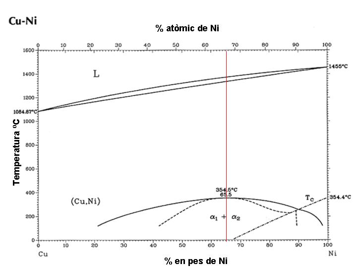 La línia vermella indica la composició estudiada. Al refredar aquest aliatge lentament (T=354.5ºC) hi ha una transformació desordre-ordre.