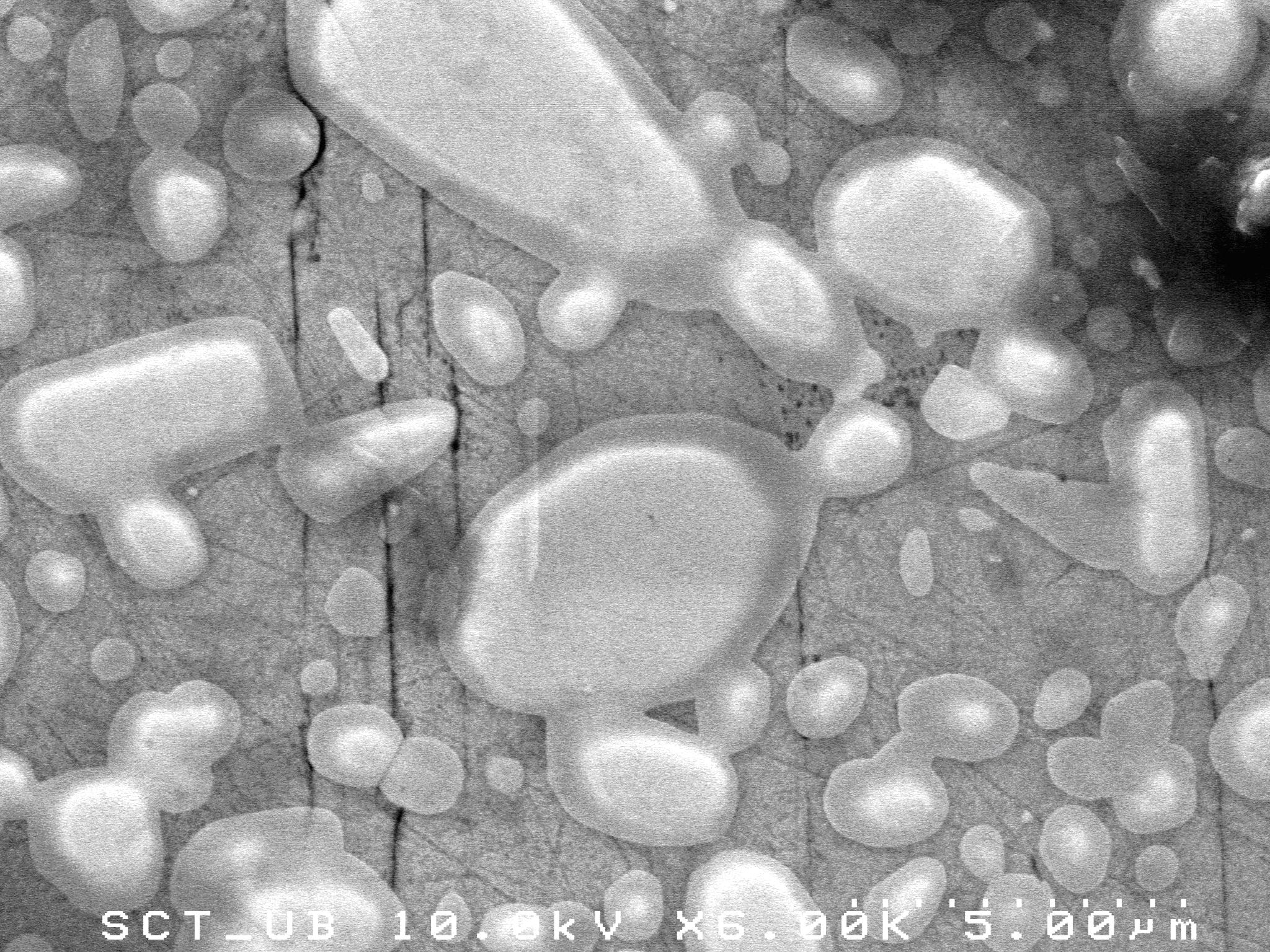 En la micrografia anterior s’observa una distribució heterogènia d’una fase majoritària (matriu) i una minoritària (precipitat). Les esquerdes observades són degudes al tractament d'oxigenació que necessita el superconductor una vegada sintetitzat, per obtenir la fase superconductora.