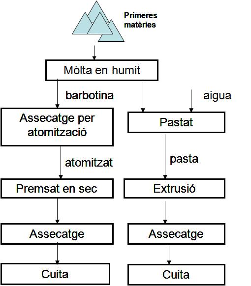 El procesado comienza con la selección de las materias primas como arcilla, feldespato, arena, carbonato y caolines. Después de homogeneizar cada componente, se mezclan y se pasan a una etapa de moltura, generalmente en húmedo, obteniendo una barbotina (Ø <200 micras,,30-0,45 Kg de agua / Kg de material seco, 60 - 70% de sólidos en suspensión). A continuación se pasa a una etapa de secado por atomización, el material seco, atomizado, está formado por partículas casi esféricas, vacías y uniformes que facilita el moldeo, con un 0,05 hasta 0,07 kg de agua / kg de material seco. Seguidamente se pasa a un prensado por compresión o extrusión y luego a cocida.