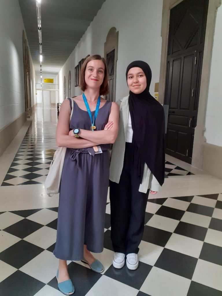 Student Hanaa Gharib (right) with Creatio researcher Alice Louail at the Faculty of Medicine and Health Sciences – University of Barcelona.