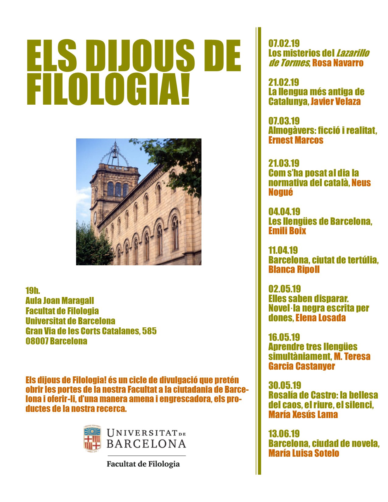 A partir del mes de febrer, la Facultat de Filologia de la Universitat de Barcelona impulsa el cicle de conferències «Els dijous de Filologia!» per posar els resultats de la recerca de la facultat al servei de la ciutadania.