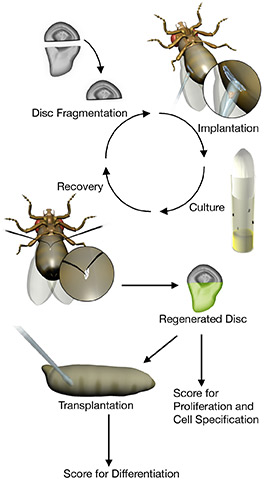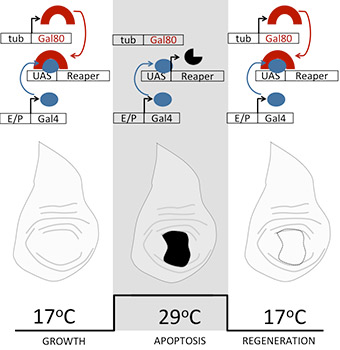 We genetically activate cell death to induce regeneration (Bergantiños et al 2010 and Smith-Bolton et al., 2009). The technique is based on the activation of apoptosis in specific zones using tissue specific transactivation drivers controlled by temperature sensitive alleles.