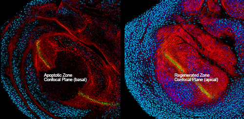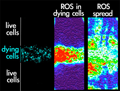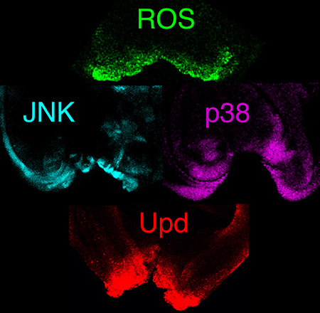 An important issue in regeneration research is to discover the early signals that trigger regeneration. Physical damage or induction of cell death result in a burst of reactive oxygen species (ROS) that spreads to neighboring healthy tissue. This event induces activation of the p38 and JNK stress activated protein kinases.