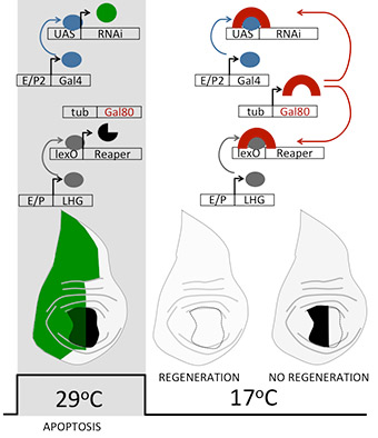 This is an alternative technique that allows two cell populations in the same imaginal disc to be genetically programmed to express different transgenes (Santabárbara-Ruiz et al., 2015). One transactivator can drive the pro-apoptotic gene (e.g. rpr or hid) whereas the other can express a tester transgene (e.g. a UAS-RNAi for a gene of interest). Using this strategy, the combination of lexA and Gal4 double transactivator system has been key for our regeneration studies. LexA is a bacterial transcription factor that binds to specific sequences known as the LexA operator or lexO. An optimized LexA transactivation system has been engineered to work together with Gal4. Briefly, chimeric proteins have been created in which LexA (L) contains the activation domain of yeast Gal4 (G) separated by a hinge region (H), which results in a Gal80TS suppressible LHG (Yagi, Mayer, and Basler 2010).