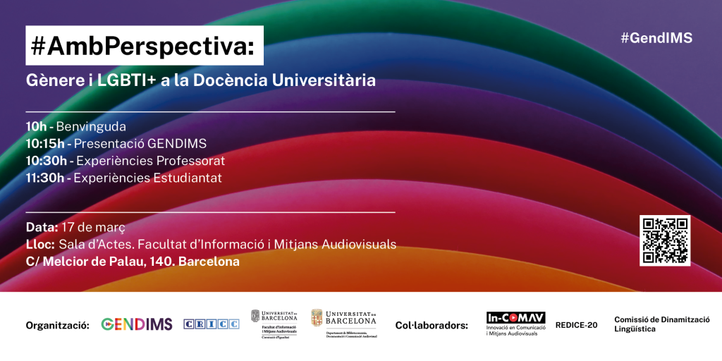 La Dra. María-José Masanet, miembro de DHIGECS, con motivo del Día Internacional de la Mujer, nos invita el próximo 17 de marzo a la Jornada «#AmbPerspectiva: Gènere i LGBTI+ a la Docència Universitària», organizada por el proyecto GENDIMS (Gender Perspective in Information and Media Studies). Se trata de un proyecto que cuenta con el financiamiento del REDICE-20 y del Centre de Recerca en Informació, Comunicació i Cultura (CRICC) de la Facultad de Información y Medios Audiovisuales de la Universitat de Barcelona.