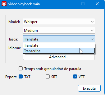 3. Finalment, haureu de triar el format en el qual voldreu la transcripció (o traducció). Nosaltres hem marcat .TXT i .VTT. Un cop triat, feu clic a "Executa".