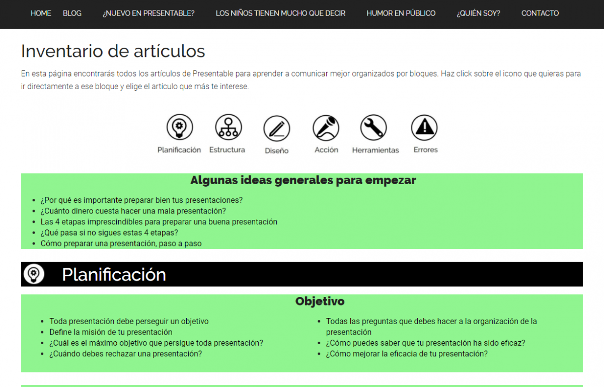 Aquí podreu trobar tot un recull d'articles dedicats a respondre diferents preguntes que tots ens fem a l'hora de preparar una classe, conferència o presentació. Ens trobem amb un contingut estructurat en 6 blocs: planificació, estructura, disseny, acció, eïnes i errors. A més d'unes primeres idees per començar.