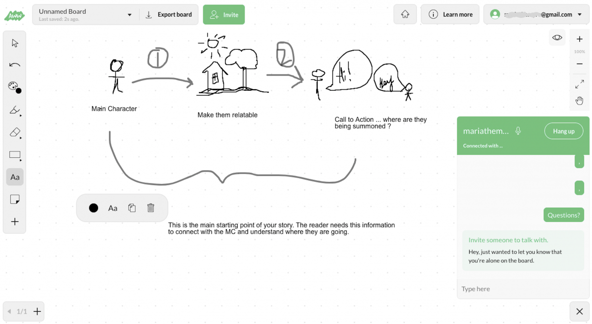 La plataforma presenta tots els elements bàsics que caracteritzen una excel·lent pissarra digital: dibuix a mà lliure, la possibilitat d'incorporar fotos i afegir text, i fins i tot una funció que ofereix la reproducció en vídeo instantània del projecte elaborat (a través d’una nova pestanya que s’obre al nevagador).