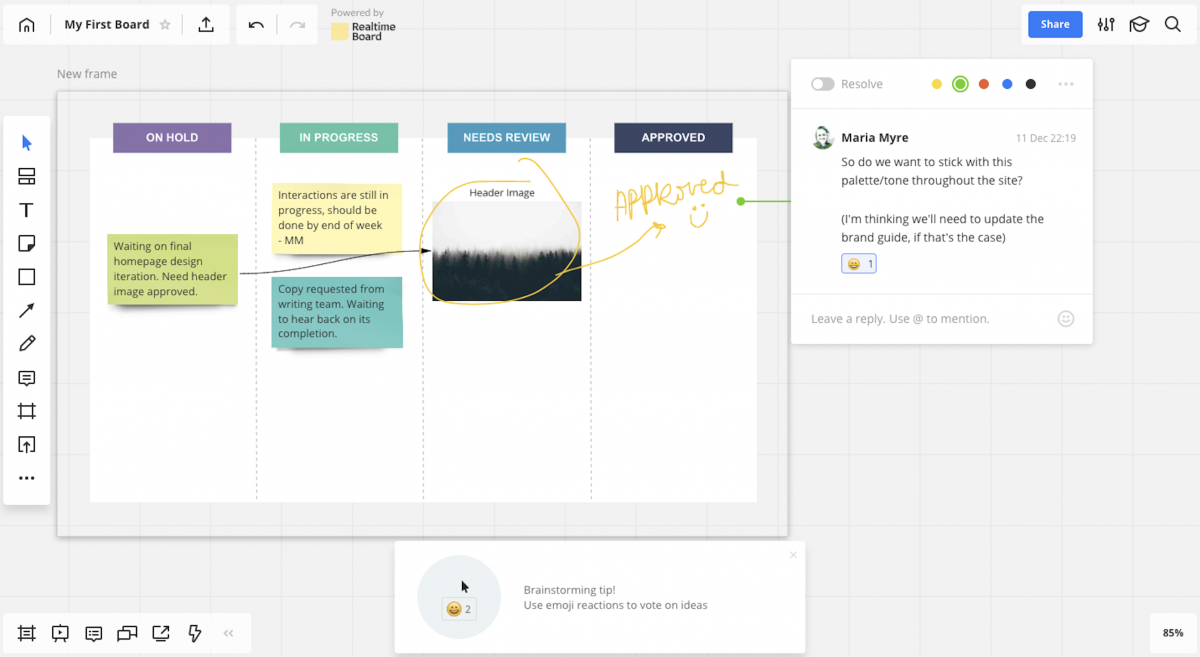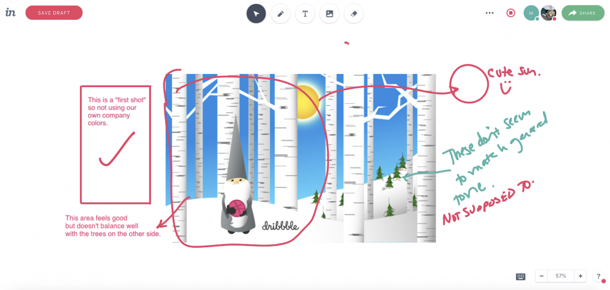 InVision Freehand ofereix als dissenyadors l'oportunitat de sincronitzar els seus fitxers d’Adobe i comunicar-se a temps real amb la resta de l'equip. Cada usuari connectat apareix com una icona a la cantonada superior dreta de la pissarra, i se li adjudica un color concret. Afegir text i penjar fitxers és tan senzill com fer clic amb el ratolí a la barra d'eines superior. I si es volen afegir formes, mantenint premuda la tecla Maj mentre es dibuixa, el propi programa de l'aplicació és capaç de reconèixer-les i “millorar-les”.