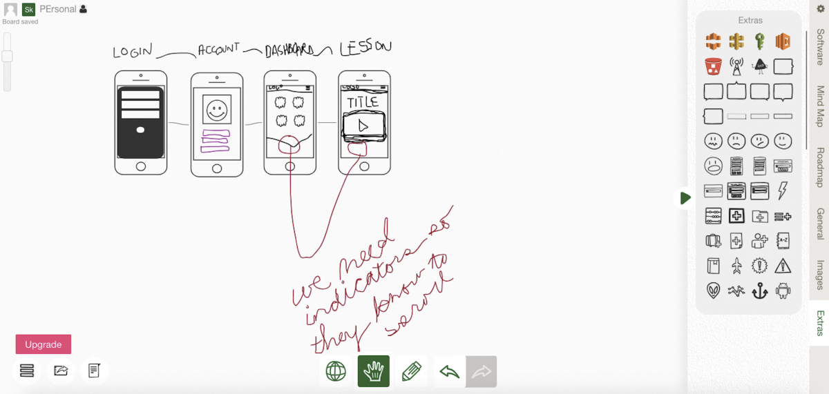 El tauler de la web inclou una gran varietat d'icones pre-dissenyades per a ser utilitzades en diagrames de programari i fulls de ruta.