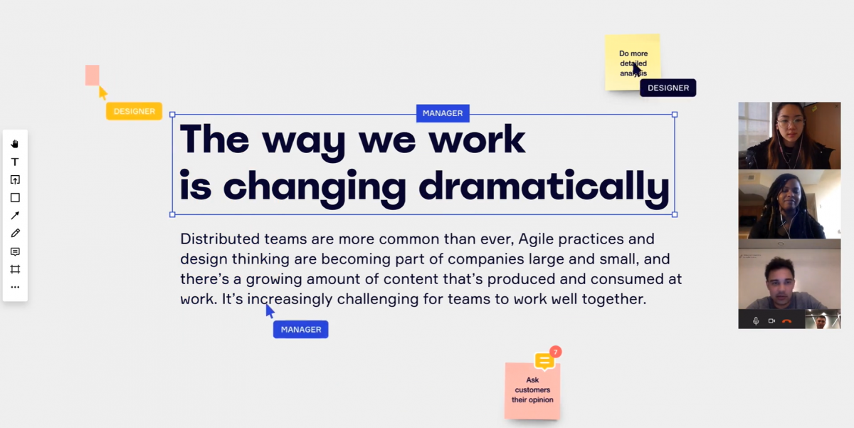 L’element principal de Miro no són les videoconferències com a tal, sinó la col·laboració a temps real dins d'un llenç infinit en el qual es poden planejar projectes a l’interior d'una enorme pissarra digital.