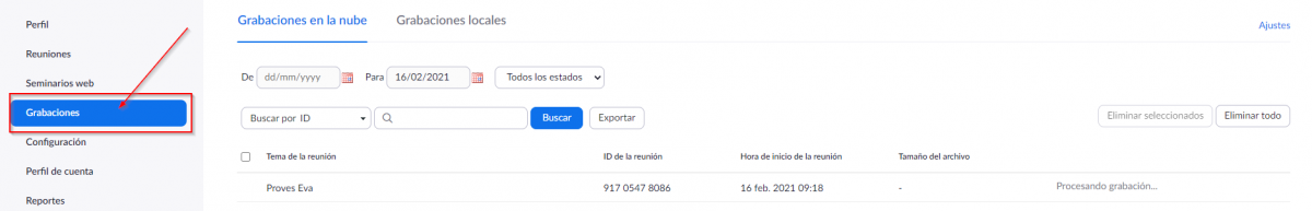 Si s'ha desat l'enregistrament de la sessió al núvol, aquest es podrà consultar des del portal de Zoom.