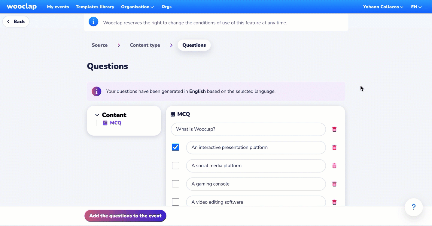 Podeu fer clic a Afegir les preguntes a l'esdeveniment per a afegir totes les preguntes generades per la IA al vostre esdeveniment Wooclap.