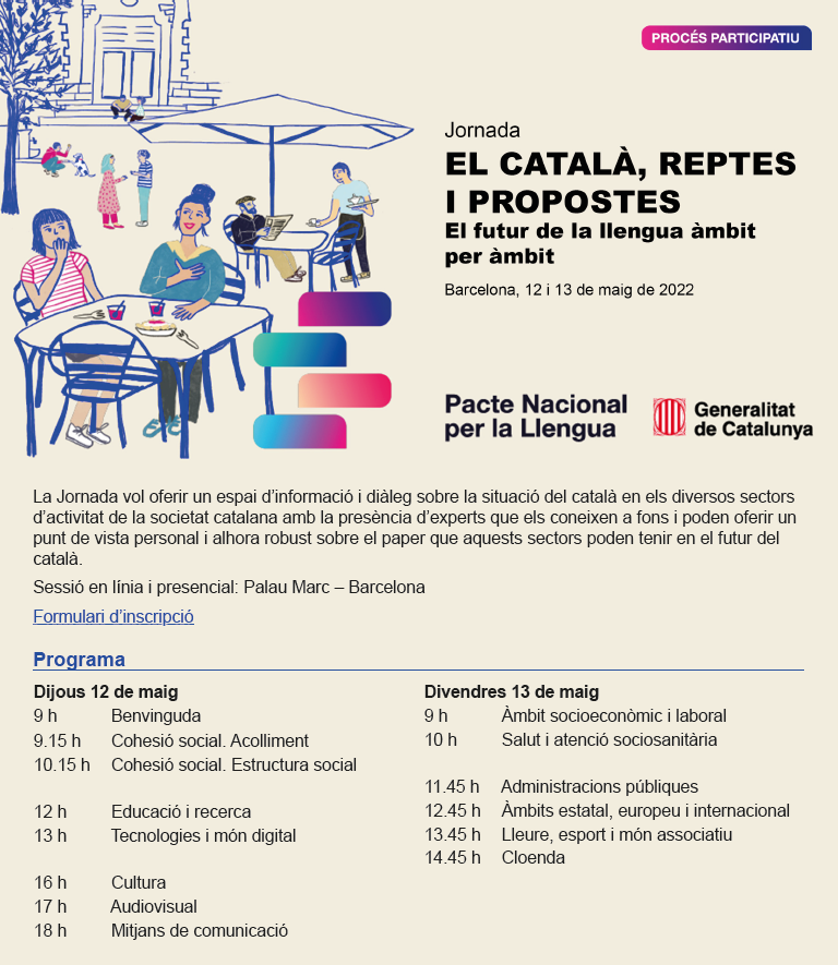 El Pacte Nacional per la Llengua és un procés participatiu que impulsa la Generalitat de Catalunya i que convida tota la ciutadania a informar-se i debatre sobre la situació de la llengua i els reptes de futur que ha d’encarar el català.