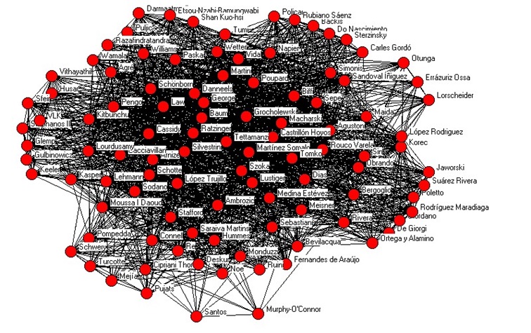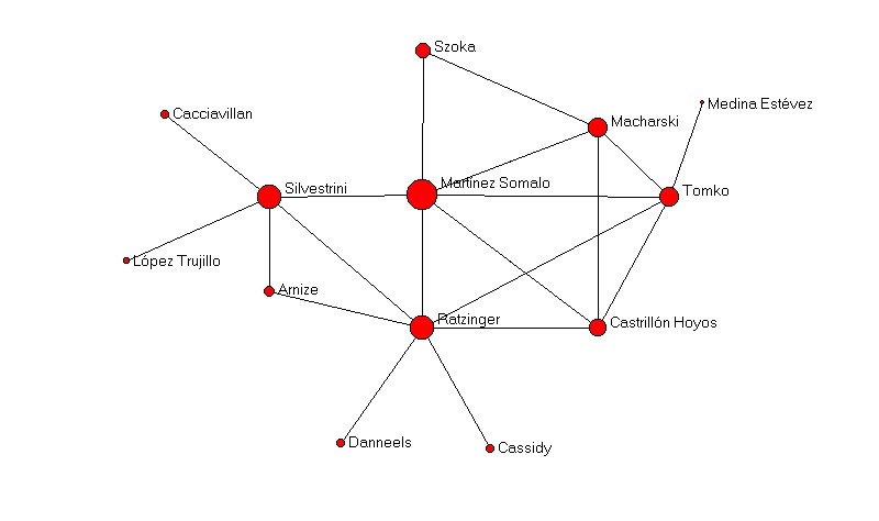 Aquí un buen ejemplo de redes: un cónclave de cardenales. Con la muerte de Juan Pablo II en abril de 2005 se abrió un proceso de sucesión en el seno del Vaticano que levantó gran interés debido al largo papado de Karol Wojtyla. El análisis de redes nos permitía prever el nombre tras la fumata blanca. Para construir esta red buscamos, en la documentación oficial del Vaticano, en qué congregaciones participaba cada cardenal, y por tanto, con qué otros cardenales solía coincidir en encuentros y en orientación.