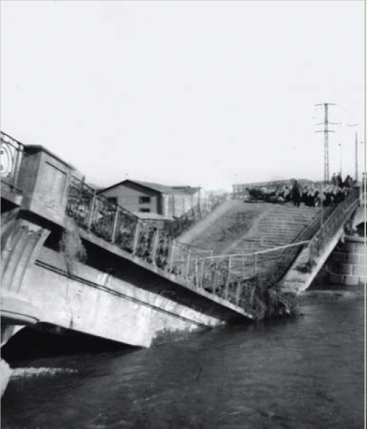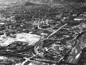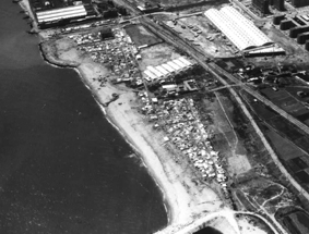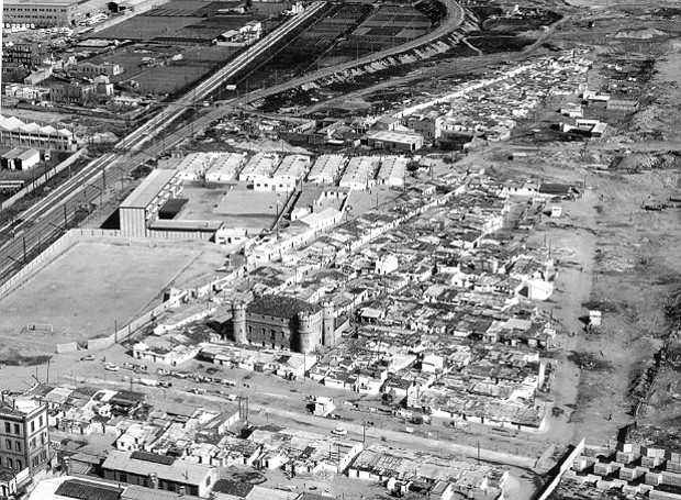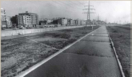| 1944. The Official Gazette publishes the Order of annexation to Barcelona of the northern territories of the river. The southern region continues to depend on Sant Adria de Besos | 1945. Plan for the Eradication of shanties. The large growth of Barcelona after the civil war, led to the emergence of large areas of shanties. Alguna de ellas en la playa, próxima al río.Some of them on the beach, next to the river. | 1947. Preparatory studies of the Regional Plan. zoning criteria are introduced. Besòs area is classified as intensive residential zone and industrial area | |