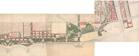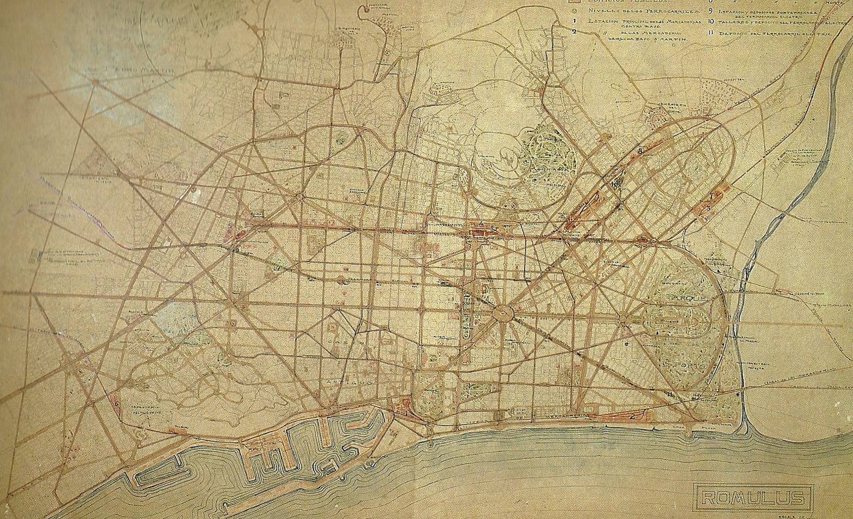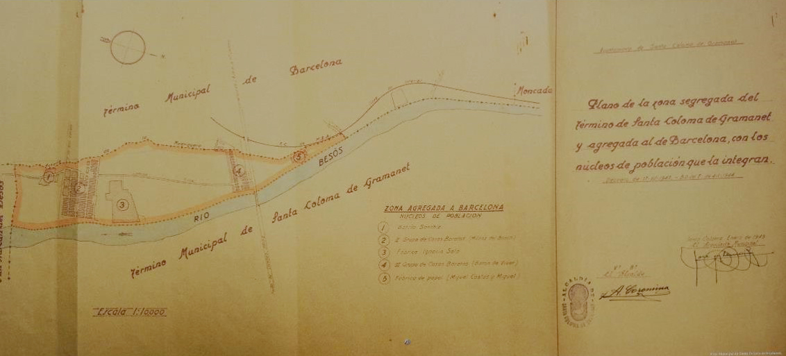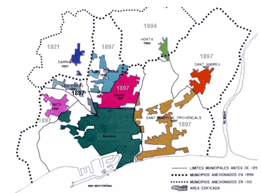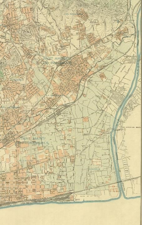 | 1897. Barcelona starts a plan for the annexation of the neighboring towns. However a border strip with river and close to Barcelona will be kept by the municipalities of Sant Adrià and Santa Coloma | 1899. The process of annexations, involves thinking a new expansion plan. Ricardo Alsina Amils will design a plan in which Besòs area combines the large park designed by Cerdà with new housing projects. | 1903-1905. Leon Jaussely, winner of the international competition known as "Linking Plan",keep the mentioned ideas. In the area presently occupied by neighborhoods of Bon Pastor andBaró de Viver, he plans a big railway sorting station |
