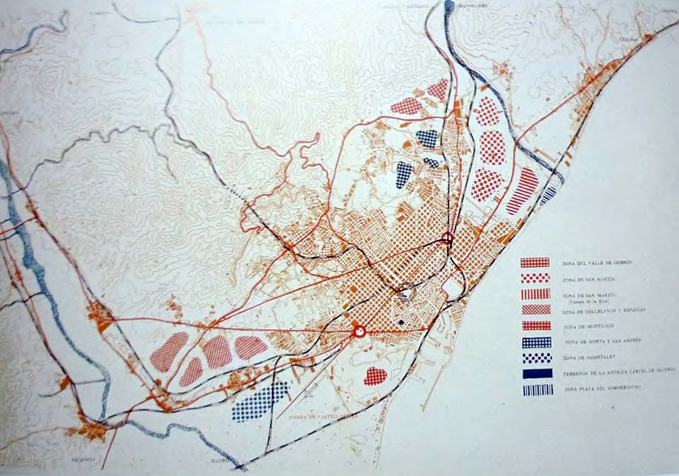 | 1953. Regional Plan with zoning. The Levant corresponding to Besòs area will be a priority in the development of city growth | 1950's. Proposal for implementation of large residential estates newly built | ||