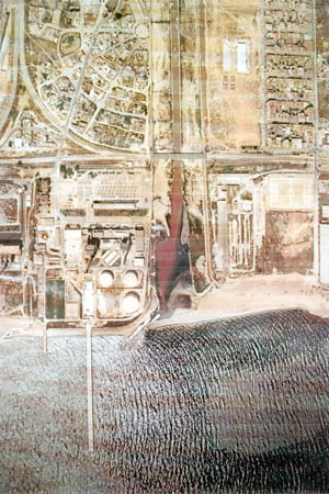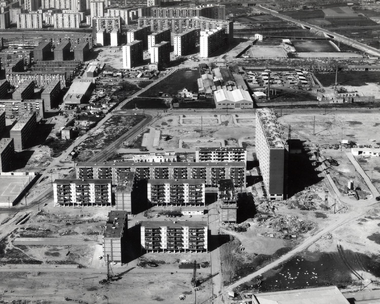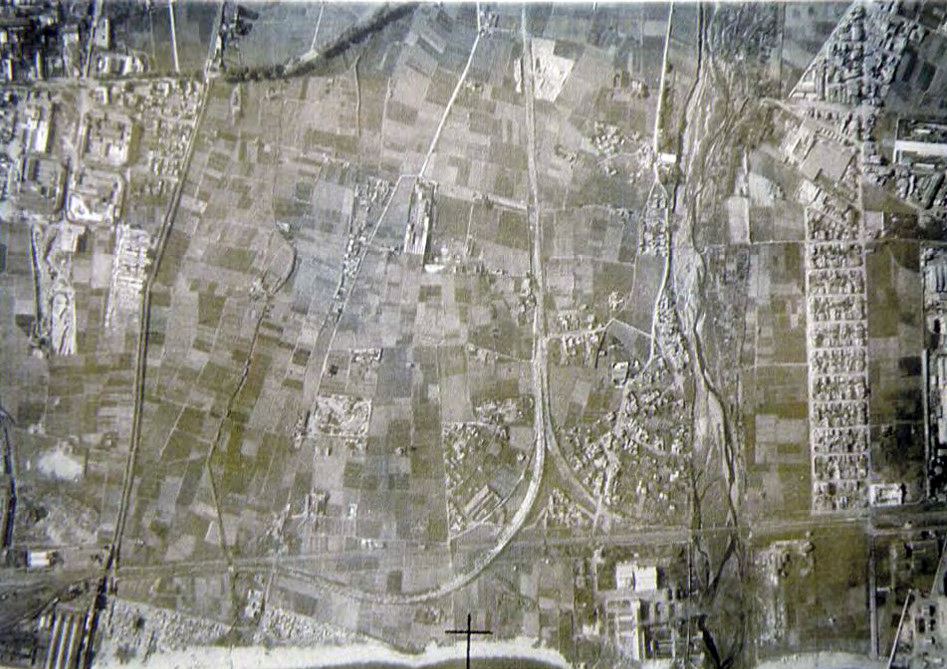 1960's. Aerial photo of the area where the housing estates of La Mina and southwest Besòs will be built. On the right the small neighborhood of La Catalana and the Besòs the river with no canalization seen. | ||