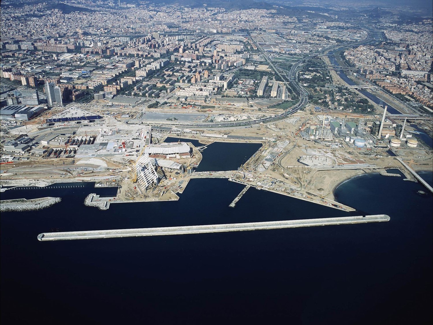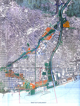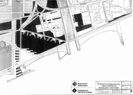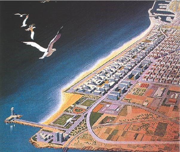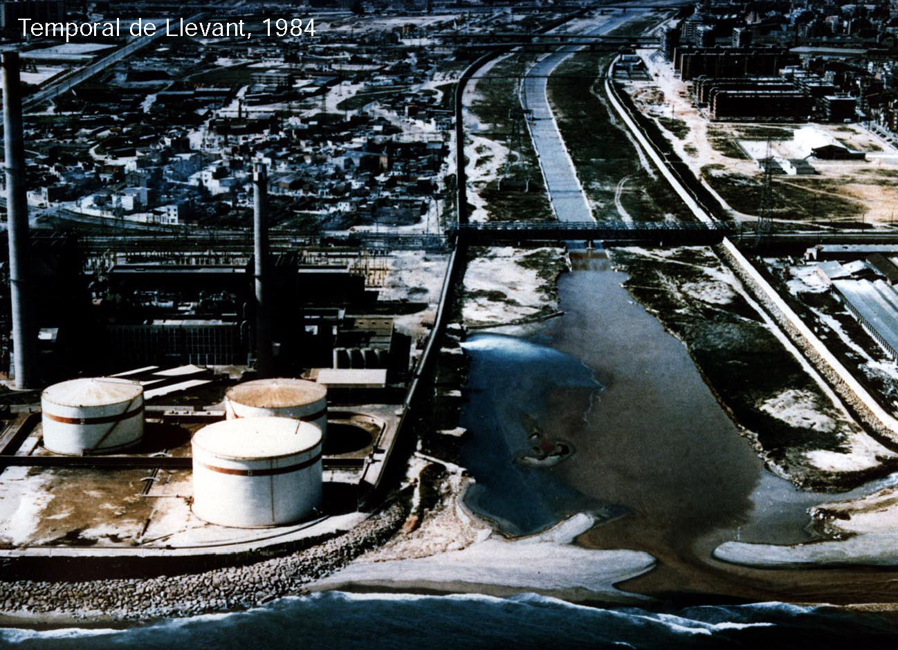 | 1966. First the Master Plan of the Metropolitan Area of Barcelona and later the Metropolitan Plan 1976, reordered land use criteria. | 1970s. Aerial photo of the area. You can see the residential and industrial area of La Mina and the Besòs river now channeled after the great floods of 1966. | 1986. Coastal Plan of the Metropolitan Corporation of Barcelona. important instrument for remodeling the waterfront of Barcelona | |