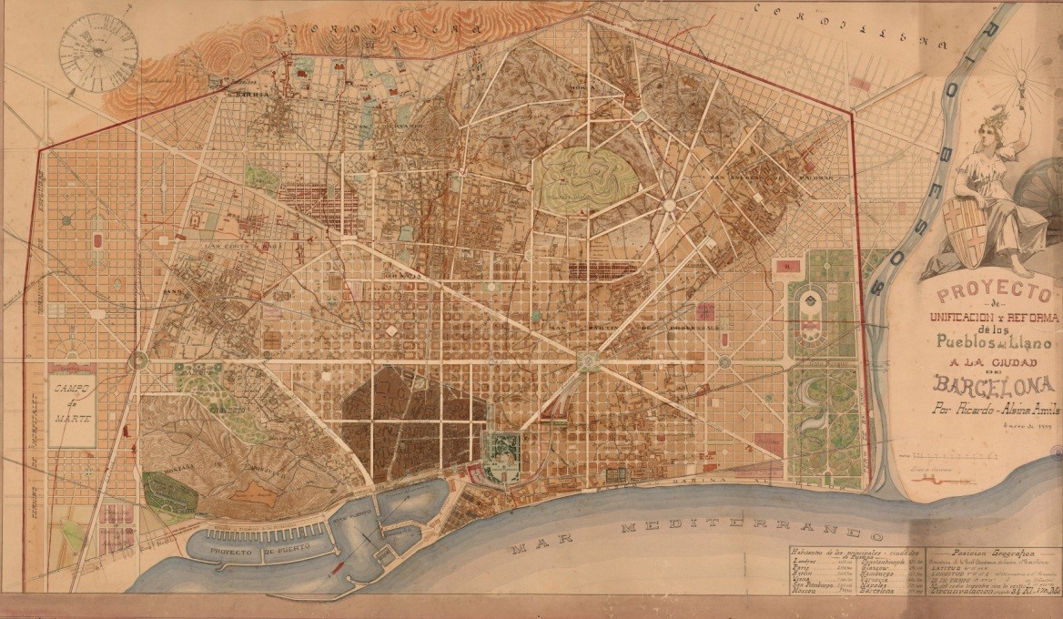 1859. Reform and Expansion Plan for Barcelona by Ildefons Cerdà. In this project, the area is intended to Besos large urban park. Topic that will be repeated in subsequent projects
