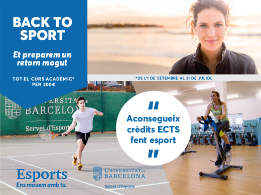 Des del Servei d’Esports de la Universitat de Barcelona us animem al BACK TO SPORT amb una promoció que no podeu deixar escapar. Aconseguiu tot el curs acadèmic (de l’1 de setembre al 31 de juliol) per 200€. Us animeu? Us esperem a tots i totes!