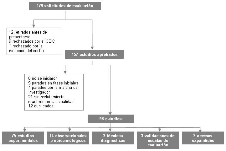 Desde el primero de enero de 2001 hasta el 31 de diciembre de 2005 solicitaron ser evaluados por el CEIC del Maresme 179 proyectos de investigación (Figura 1). De los cuales, 12 se retiraron antes de su presentación, ya sea por el promotor o el investigador principal (IP), el CEIC rechazó 9, y la dirección del centro denegó su permiso en otro. De los 157 restantes, 4 no se iniciaron por retirada del promotor o el IP antes de firmar el contrato, otro por problemas de financiación, otro por complejidad del estudio, otro por la aparición de nuevos estudios en contra de la hipótesis inicial, y otro por problemas técnicos con el placebo. El promotor o IP pararon prematuramente 9 estudios por razones diversas, y en cuatro fue debido a la marcha del IP del lugar de trabajo sin dejar un sustituto para su continuación. En 21 estudios no se reclutaron pacientes y, 5 están activos en el momento de realizar la presente revisión. Finalmente, 12 proyectos estaban duplicados por presentar un IP diferente en distintos centros a los que el mismo CEIC da cobertura. Así pues, la presente revisión se ha efectuado sobre 98 estudios concluidos, entre los que se pueden diferenciar, 75 estudios experimentales, 14 observacionales o epidemiológicos, 3 sobre técnicas diagnósticas, 3 validaciones de escales de evaluación, y 3 eran accesos expandidos a un determinado fármaco.
