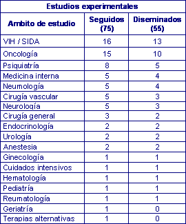 Tabla 3. Especialidad o ámbito de los estudios experimentales finalizados, seguidos y publicados.