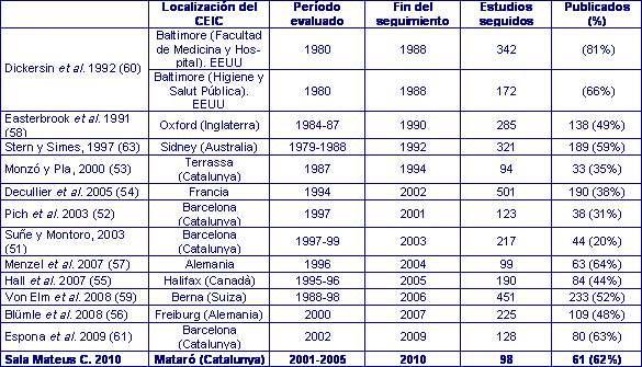 En base a la legislación vigente, el CEIC está en una posición ideal para seguir la progresión de los proyectos que él ha aprobado. Se han publicado varios estudios de seguimiento sobre proyectos de investigación que diversos CEIC y entidades reguladoras habían aprobado (Tabla 5). Podemos ver que las tasas de publicación de los resultados de la investigación son muy variables, yendo desde las cifras más bajas aportadas por grupos españoles, el 20% del Hospital del Valle de Hebrón de Barcelona (51), el 31% del Hospital Clínico de Barcelona (52), y el 35% de la Mutua de Terrassa (53), pasando por el 38% de franceses (54), 44% de canadienses (55), 48% y 70% de alemanes (56,57), el 52% de ingleses (58) y suizos (59), 81% y 62% (60) de americanos, y recientemente, el 63% del grupo del Hospital del Mar de Barcelona (61), hasta el 98% en un trabajo antiguo (62). Nuestra revisión ha detectado una tasa de publicación similar a la del grupo de Espona et al. (61), que realizó un seguimiento de 7 años.