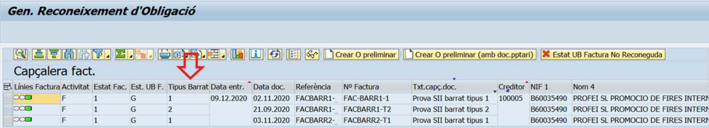 Quan es marqui l’opció 1 i el document de barrat sigui autoritzat, s’alliberarà la factura o factures comptabilitzades i tornaran a la safata del gestor d’associar factures a obligacions, amb el codi 1 en la columna Tipus Barrat. Exemple: