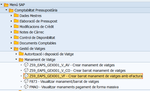 En el cas de barrat de documents FV, amb el que es comptabilitzen factures de viatge prèviament pagades amb la targeta Diners Club (agències VECI i Atlanta), haureu de fer servir la transacció Z59_EAPS_GEX001_VF - Crear barrat manament de viatges amb eFactura