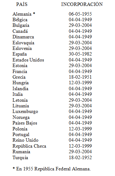 La O.T.A.N. se fundó con la firma por 10 países del Tratado de Washington el 4 de abril de 1949, aunque no entró en vigor hasta el 24 de agosto de 1949 en que se completó su ratificación por todos los países firmantes; como figura en el cuadro 10, posteriormente se han ido incorporando otros estados hasta sumar el número de 26 que actualmente conforma la organización[17].