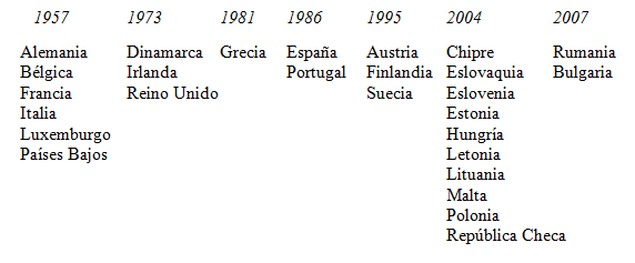 La U.E., surge de la necesidad de acabar con la confrontación entre las potencias europeas, origen de dos guerras mundiales en las primeras décadas del siglo XX, y tiene como antecedente el Tratado de París firmado el 18 de abril de 1951 por el que se formó la Comunidad Europea del Carbón y del Acero (C.E.C.A.); los mismos 6 países firmantes serían los signatarios el 25 de marzo de 1957 del Tratado de Roma, originario de la Unión Europea, entonces denominada Comunidad Económica Europea. El proceso de incorporación de los 27 países miembros se ha producido en siete etapas que aparecen enumeradas en el cuadro 7.